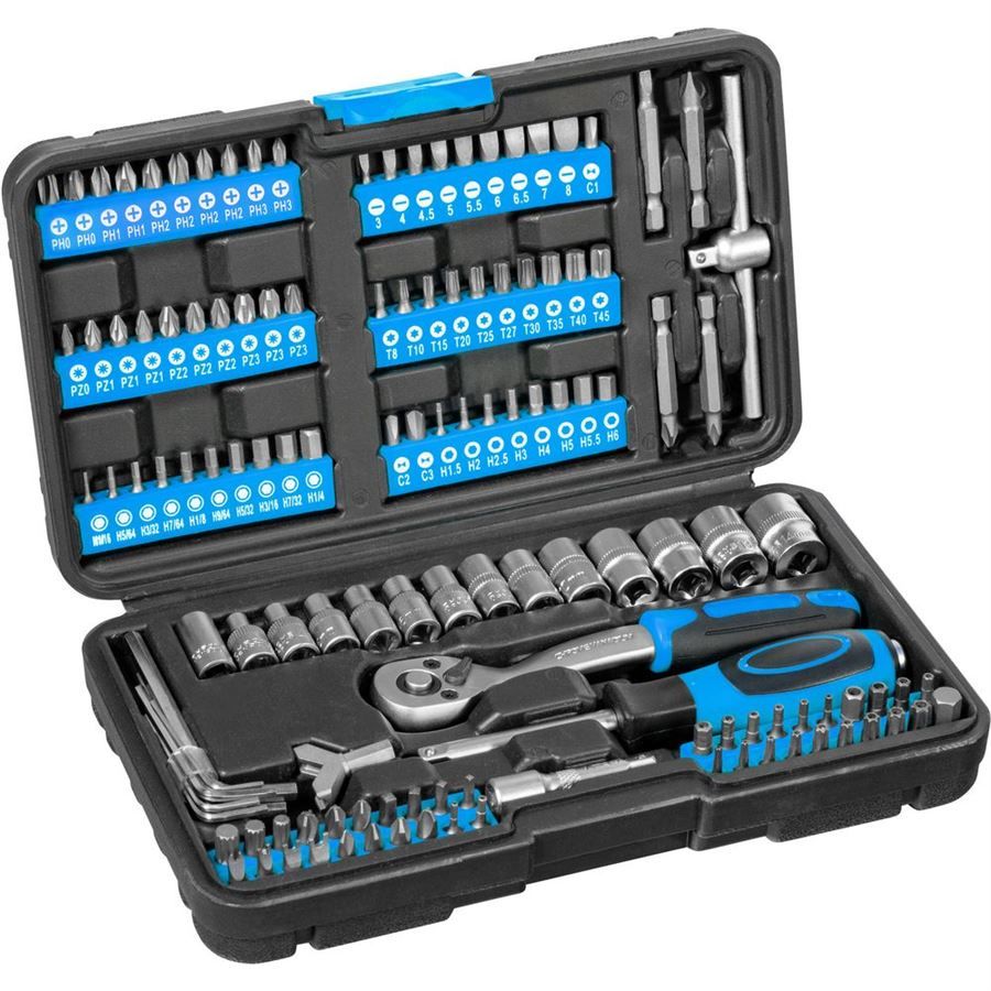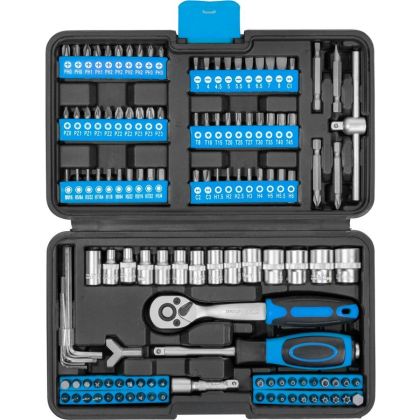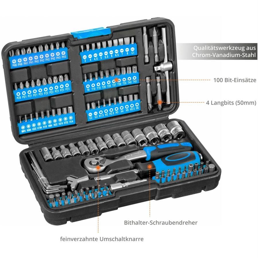 Tato 130 dílná sada nářadí od Güde obsahuje komplexní sortiment 100 ks různých typů bitů, včetně bitového šroubováku, bitový adaptér 6,3 mm (1/4"), ráčnu 1/4" se 72 zuby, prodloužení, vratidlo a 13 nástrčných hlavic, praktický hákový (Y-bit) a 4 dlouhé bity. Vše je bezpečně uloženo v praktickém plastovém boxu.