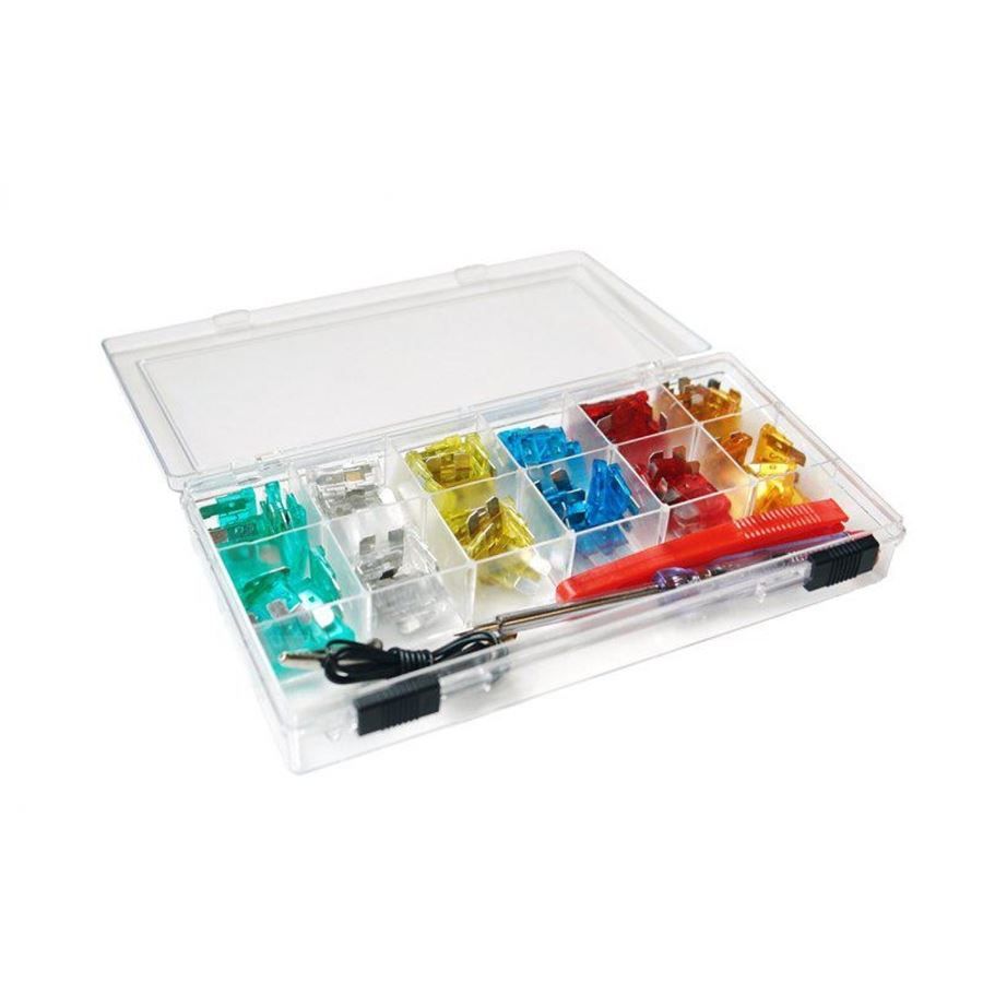 Sada obsahuje: 15 ks 5 A 15 ks 10 A 15 ks15 A 15 ks 20 A 15 ks 25 A 15 ks 30 A Zkoušečka pojistek, zkoušečka fáze a držák pojistek