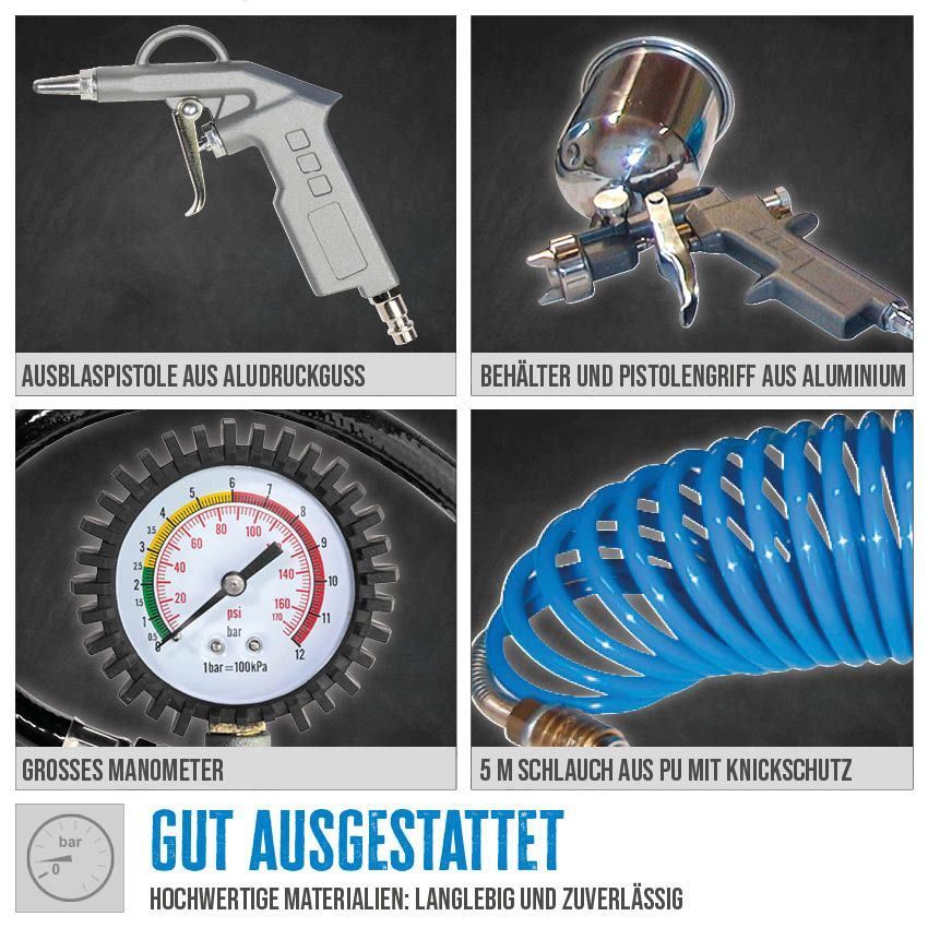 Složení sady: stříkací pistole s vrchní nádobkou, hustilka pneumatik, ofukovací pistole, spirálová hadice.