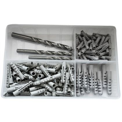 70 ks hmoždinek pr. 6 mm 80 ks hmoždinek pr. 8 mm 10 ks hmoždinek pr. 10 mm 1 vrták do kamene pr. 6 mm 1 vrták do kamene pr. 8 mm 1 vrták do kamene pr. 10 mm