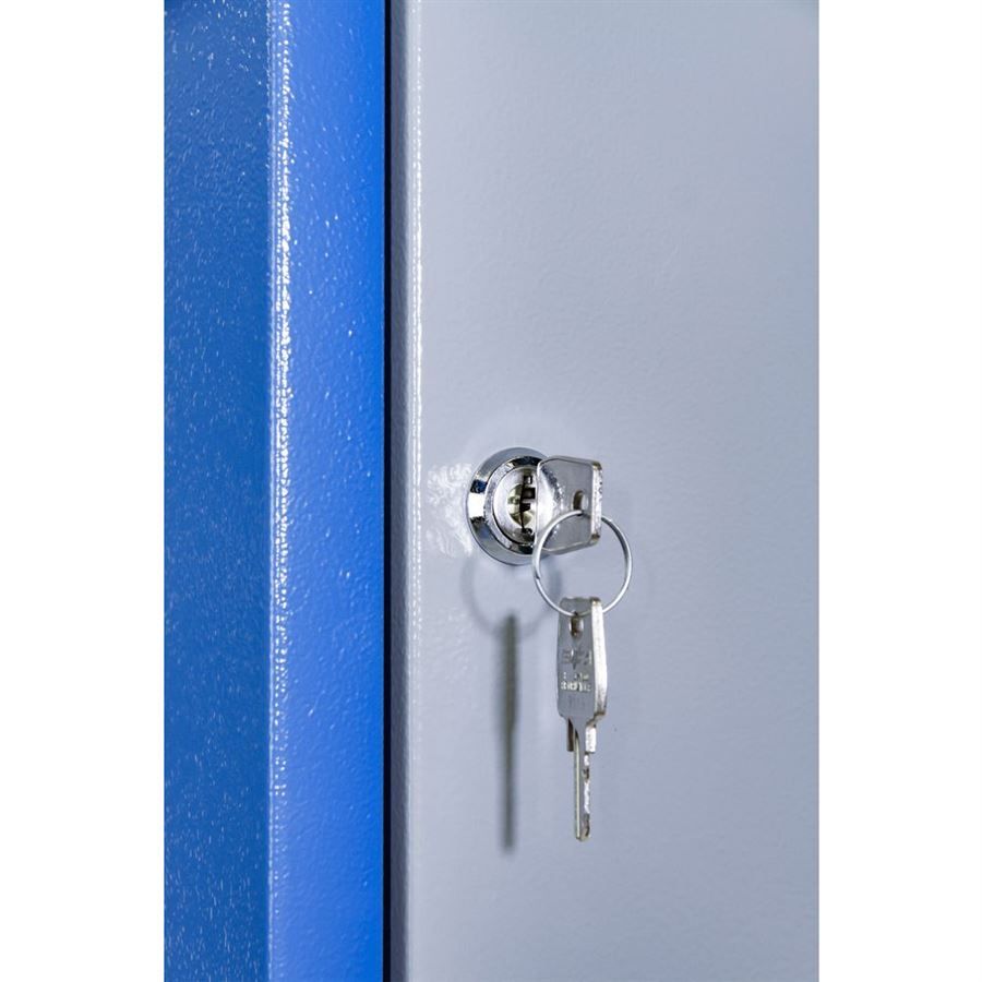 Vybavení: třídveřová skříň (-> uzamykání cylindrickými zámky, 2/2/2 klíče); zesílené dveře (-> vnitřní výztuže); vrchní/spodní odvětrávací štěrbiny; integrované rámečky na jmenovky.