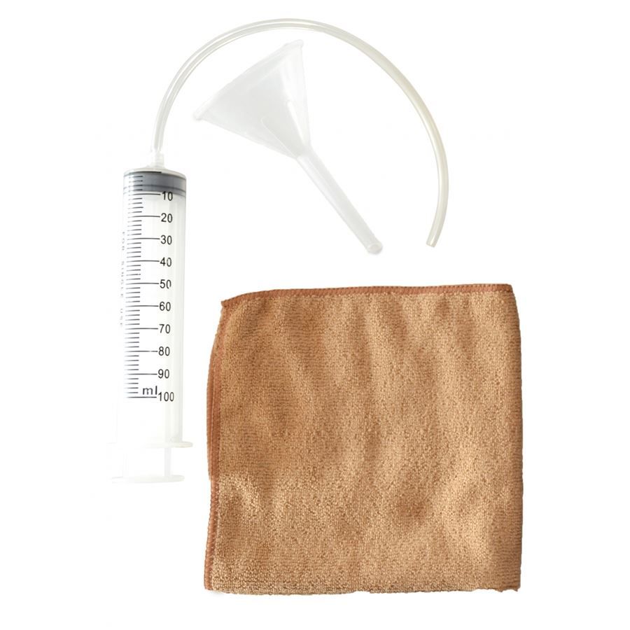 Složení soupravy: pístová odsávačka (-> 100 ml, délka nasávací hadičky: 30 cm), plnicí trychtýř, utěrka z mikrovlákna (-> 30 x 30 cm).