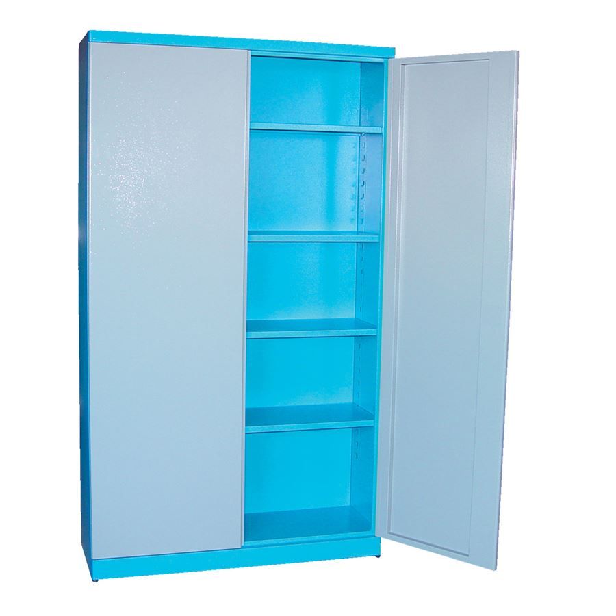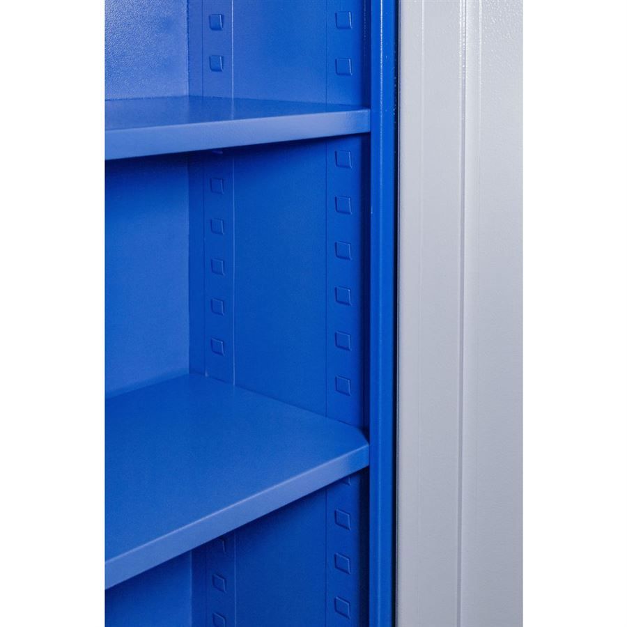 Vybavení: dvoudveřová skříň s uzamykáním cylindrickým/rozvorovým zámkem (-> dvojité uzamčení, 2 klíče); čtyři vyjímatelné police (-> volitelné nastavení výšky, nosnost: 50 kg).