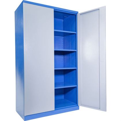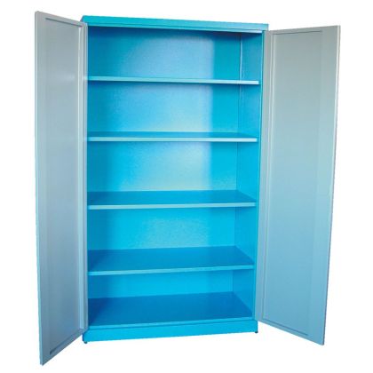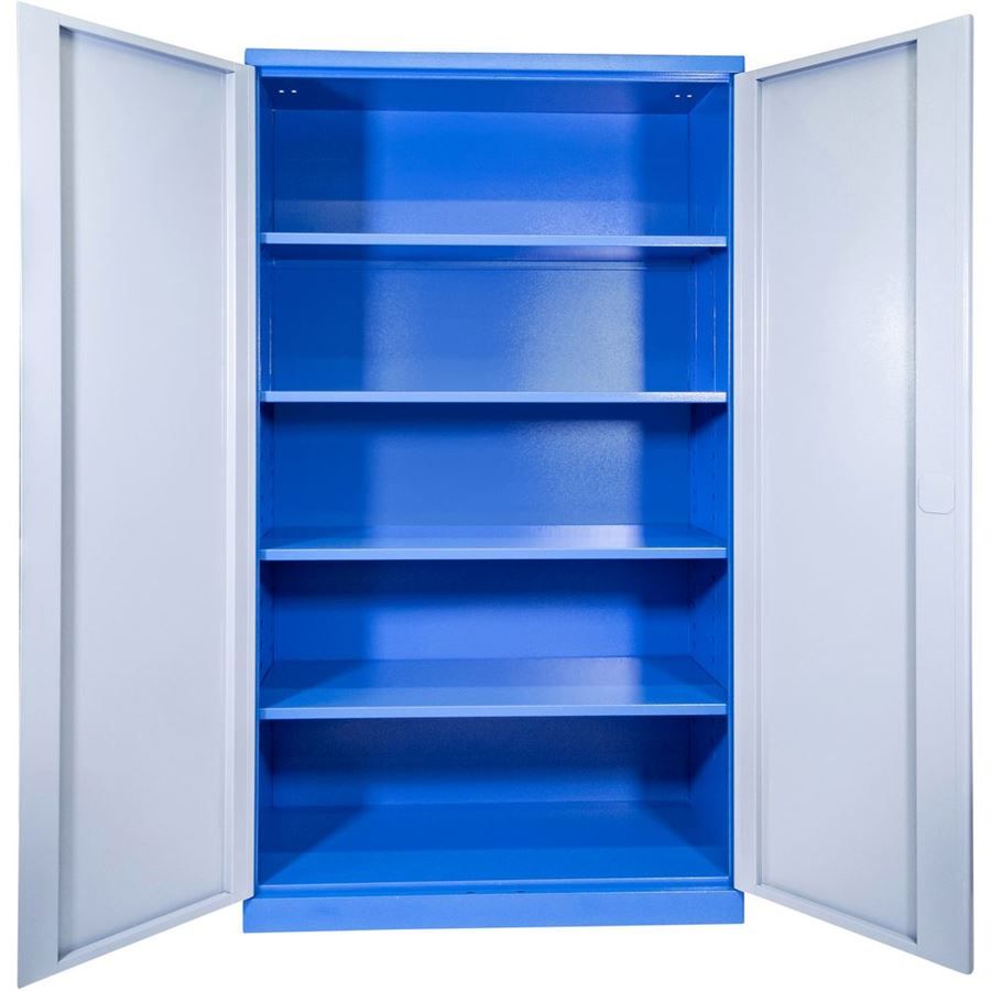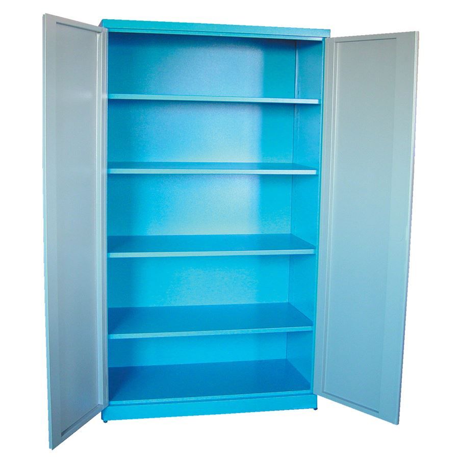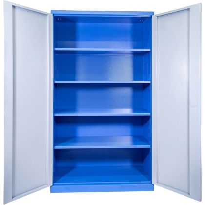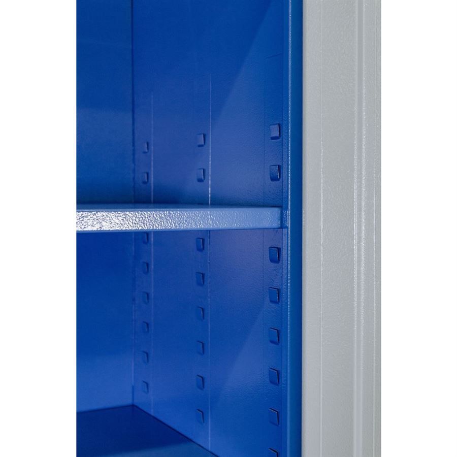 Vybavení: dvoudveřová skříň (-> uzamykání cylindrickým/rozvorovým zámkem - dvojité uzamčení, 2 klíče); čtyři vyjímatelné police (-> volitelné nastavení výšky, nosnost: 50 kg).