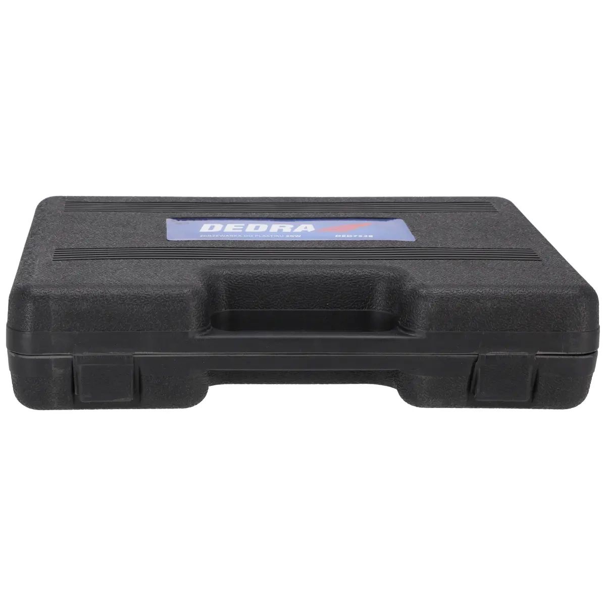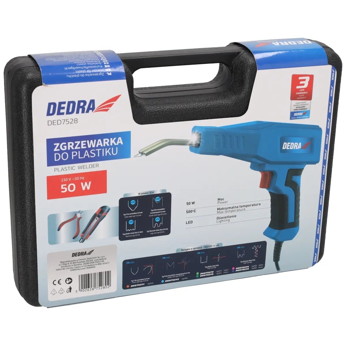 Přístroj je vhodný k opravám a zpevňování poškozených plastů různých typů a umožňuje expresní lepení mnoha poškozených předmětů v domácnosti a garáži i součástí automobilů, např. nárazníků, palubních desek. Napájení 230 V/50 Hz, výkon 50 W, max. pracovní teplota 500°C. Sada obsahuje 4 různé sponky pro svařování 400 ks: 100 ks typ M (tloušťka 0,6 mm), 100 ks typ V (tloušťka 0,8 mm), 100 ks typ malá vlna (tloušťka 0,8 mm), 100 ks typ velká vlna (tloušťka 0,8 mm), kleště, řezačka, návod k použití.