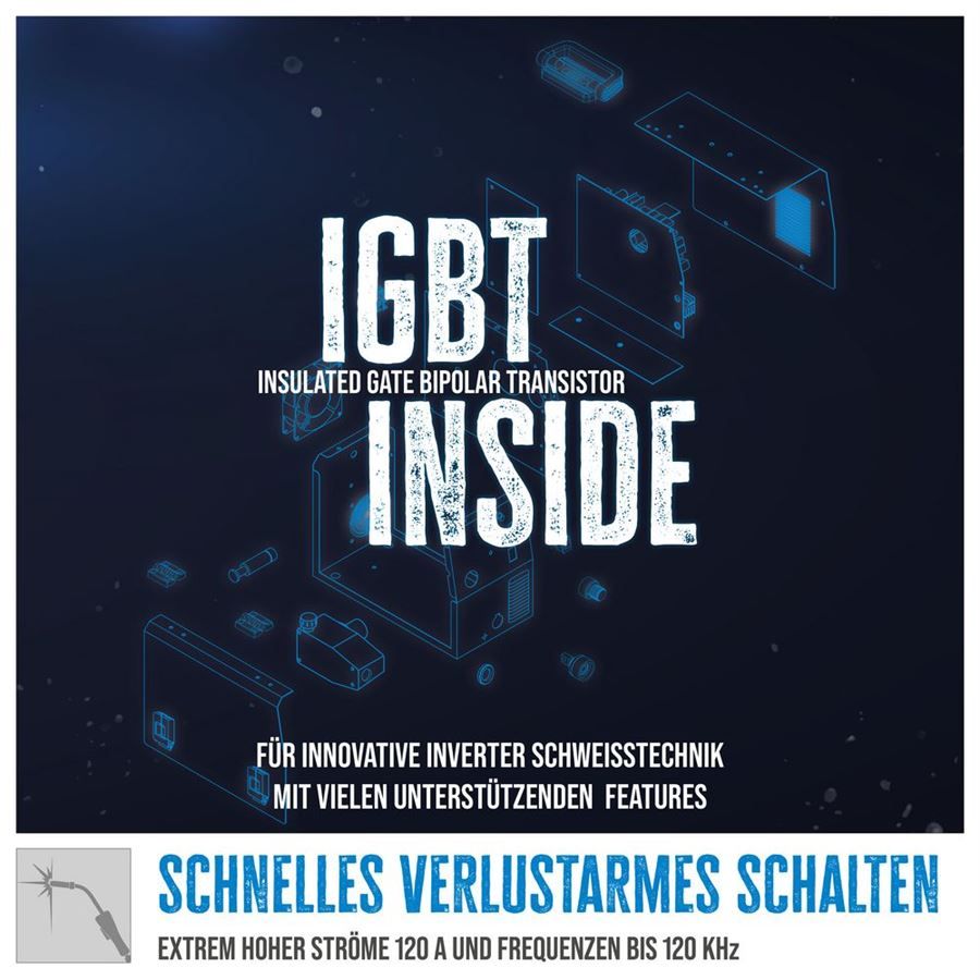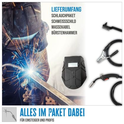 Příslušenství: 2 m svařovací hořák, zemnící kabel, drátěný kartáč s kladívkem, štít, náhradní kladka, 3 proudové trysky 0,9 mm, plněný drát (0,9 mm / 0,45 kg).