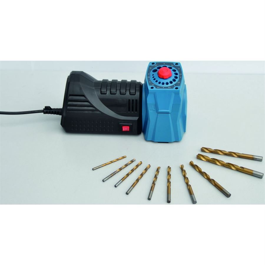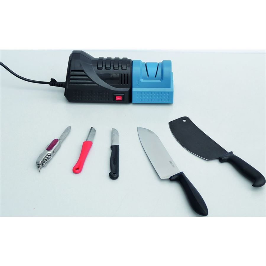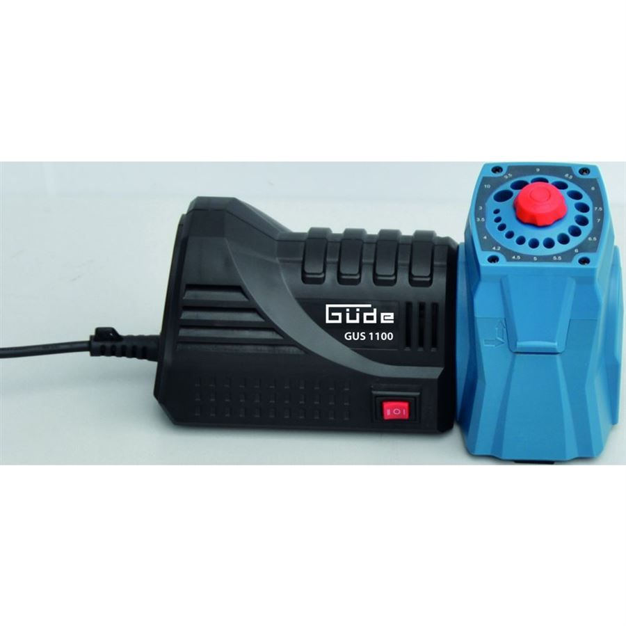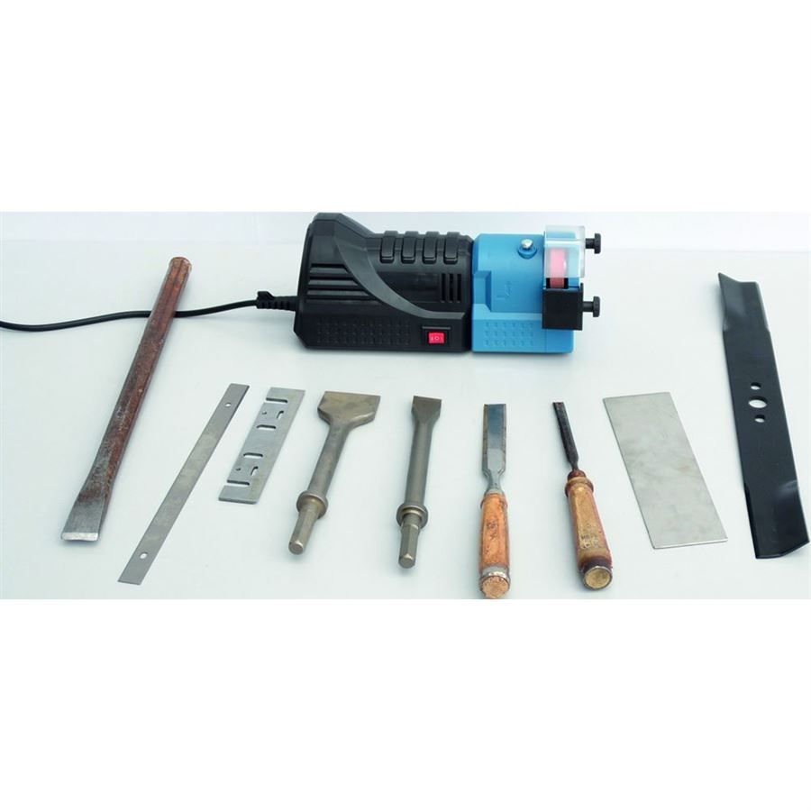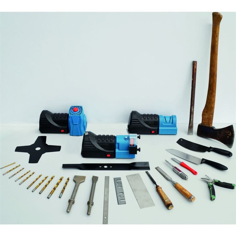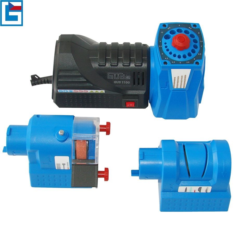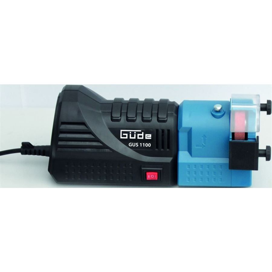 Víceúčelová ostřička GÜDE, určená k ostření nožů, nůžek, broušení břitů dlát, sekáčů, hoblovacích nožů nebo ostření špiček spirálových vrtáků.
