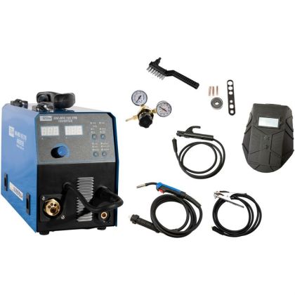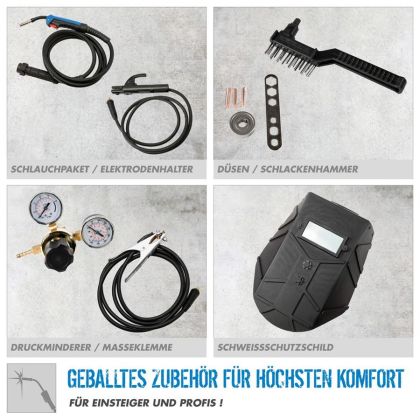 Příslušenství: 3 m svařovací hořák MB 15 EURO, kabel s držákem elektrod, zemnící kabel, drátěný kartáč s kladívkem, štít, podávací kladka, redukční ventil, sada trysek.
