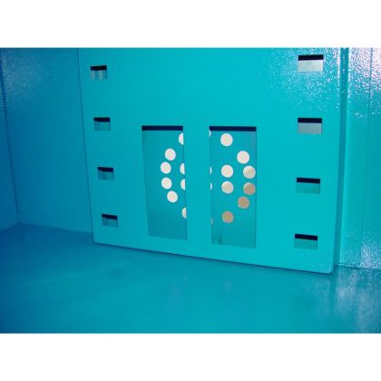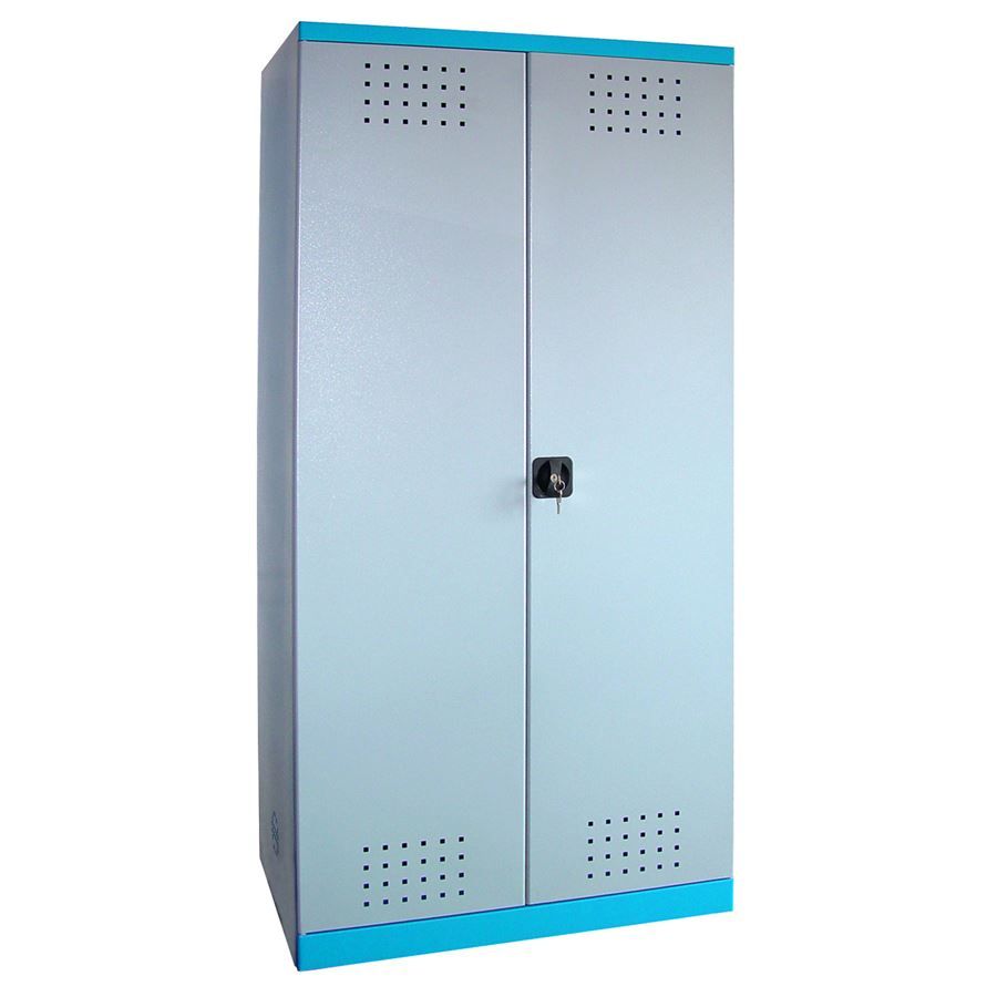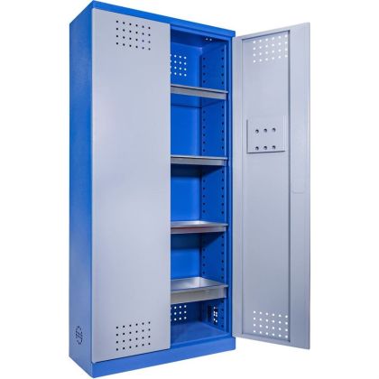 Vybavení: dvoudveřová skříň (-> uzamykání cylindrickým/rozvorovým zámkem - dvojité uzamčení, 2 klíče); 4 výsuvné vany z pozinkovaného plechu (-> volitelné nastavení výšky, nosnost: 30 kg); systém odvětrávání skříně (-> děrovaný korpus/dveře). Konstrukce: ocelový rám se soklem (-> 1.920 x 920 x 380 mm, oblé hrany).