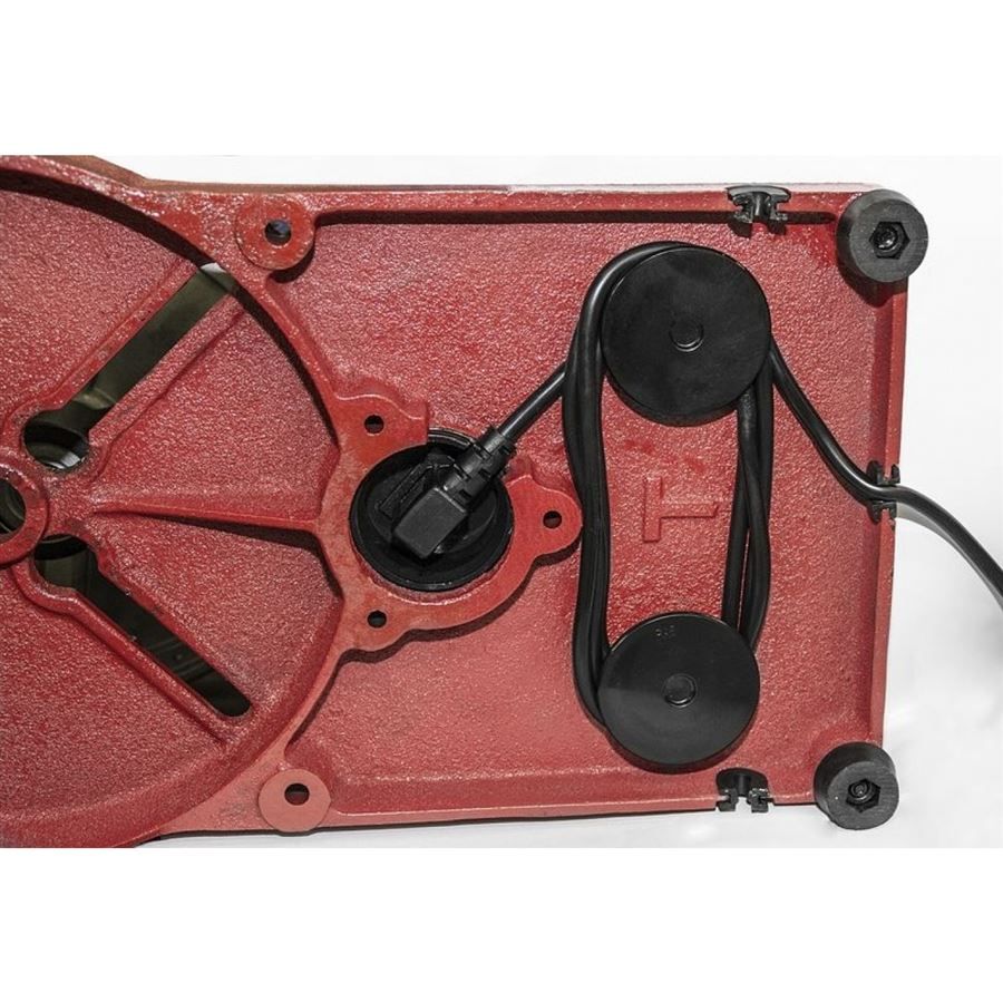 Konstrukce: hliníkové řemenice (2), kuželové kolo (1), vřeteno s kónickým úchytem/přesnými kuličkovými ložisky, kuželový trn MK2, otočný pracovní stůl (-> průměr: 220 mm; s drážkami pro upevnění svěráku), základní deska z litiny (-> rozměry d x š: 250 x 435 mm; včetně vývrtů pro stacionární ukotvení vrtačky a opěrných patek).