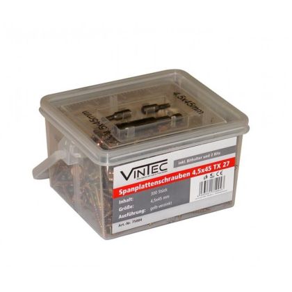 300 ks pozinkovaných vrutů 4,5 x 45 mm, hlavička Torx TX 27, 1 x držák bitů, 2 x bit TX 27