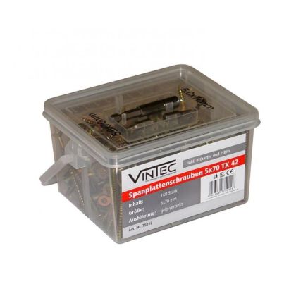160 ks pozinkovaných vrutů 5 x 70 mm, hlavička Torx TX 42, 1 x držák bitů, 2 x bit TX 42