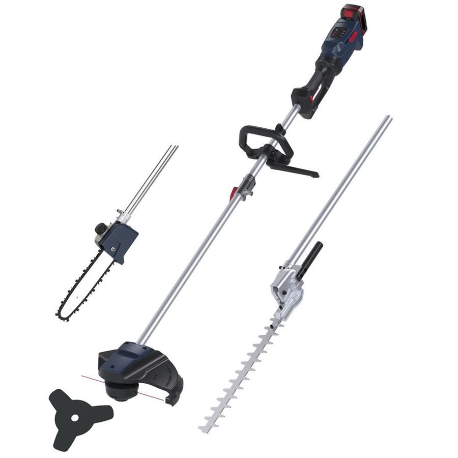 Multifunkční sada akumulátorové jednotky Güde a tří samostatných nástavců, určená ke komplexní péči o zahradu a zeleň.