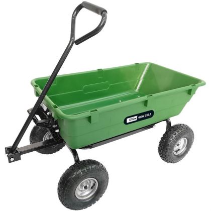 Praktický tažný vozík, vhodný pro přepravu sena, trávy, zahradních odpadů, dřeva, zeminy apod. v okolí domu, na dvoře, po zahradě atp. Vyklápěcí korba z tvrzeného plastu (-> objem: 75 l, nosnost: 250 kg), výborné manévrovací schopnosti (-> vnitřní poloměr zatáčení: 32 cm). Konstrukce: stabilní ocelový podvozek, 2 nápravy (-> pojezdová kola s pneumatikami - průměr x šířka: 10 x 4“), tažná rukojeť s pěnovou povrchovou vrstvou. Celkové rozměry (d x š x v) s/bez oje: 1.100 x 490 x 945 mm/ 1.100 x 490 x 500 mm.