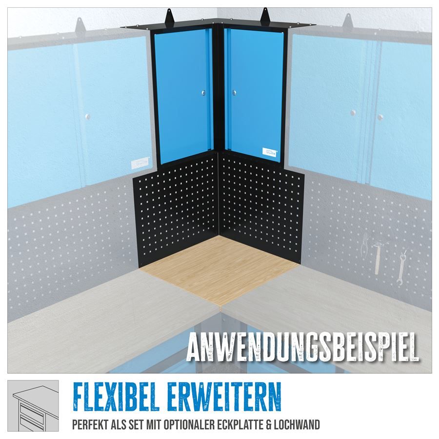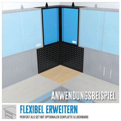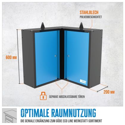 | Tato rohová nástěnná skříňka se dvěma dveřmi je součástí důmyslného a super jednoduchého doplňku řady Güde Eco Line. Je vyrobena na míru a umožňuje optimální využití rohu místnosti – zejména v kombinaci s odpovídající sadou děrovaných desek a rohovým panelem pro spojení dvou pracovních stolů. Takto snadno proměníte často nevyužitý prostor v další pracovní a úložný prostor. | |
