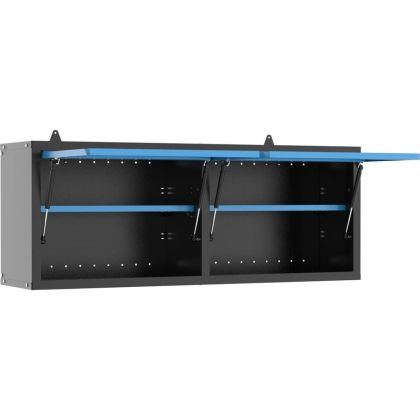 Konstrukce: korpus z ocelového plechu, úchyty pro montáž na stěnu (2), barevné provedení: RAL 9005 (rám, police), RAL 5015 (dvířka).